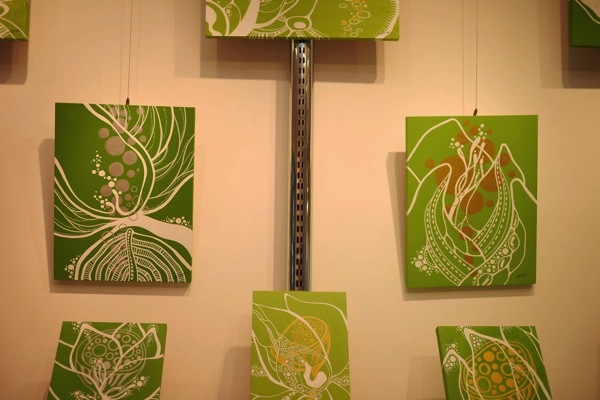 ぜひ実際に見て欲しいのですが、様々な表情の緑があります。川連さんに聞いたところ、作品に取り組むたびに緑色を作るそうです。写真向かって左側に銀色、右側に金色があしらってあり、濃い緑色には銀色、薄い緑色には金色が描いてあるそうな。